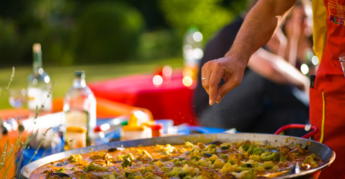 Es läuft alles ganz spontan ab, in kürzester Zeit ist der Tisch mit leckeren spanischen Spezialitäten gedeckt und man sitzt zusammen und plaudert über Paella, Sonne, verrückte Gäste und natürlich gute Rezepte. Plötzlich sind die Köche wieder am Start und Pedro gesellt sich einfach dazu. Er zelebriert eine Paella und ist gerne in seinem Element. Alle verstehen sich in der Küche sehr gut.